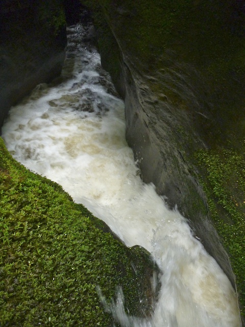Well! We found the creek quite high. The start of the first constriction was a churning sea of foam. It didn’t look to good to go down and perhaps with a big jump you could jump out past the white water – but it looked dangerous and the depth would be unknown.
