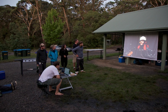 In the early evening, Shane had set up a projector and a slide show was held. Some of the canyoners had been canyoning in costumes, and there was a prize for best costume. Luke from UNSW Outdoor Club won, by acclamation. His costume was top hat and tails – very formal! There were several spongebobs, some clowns, a monster, and Max in his mankini.