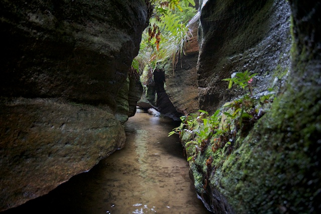 The canyon was in really nice condition. The water was up a fair bit – but it was not dangerous. The creek has a small catchment and we did not have any problems. We were also lucky with the weather. At the end of the canyon, while we were having lunch in a cave, there was a big storm. We had a lot of thunder and lightning but not much rain where we were. Others, canyoning nearer Mt Wilson, experienced heavy rain and hail, and then probably some panic as water levels rose. Luckily, they were able to climb out of the canyon.