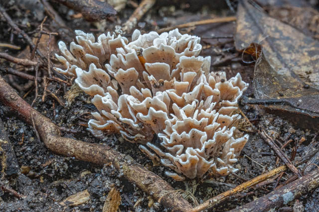 The one above is a common small polypore that grows in soil. I had originally thought it was Stereopsis hiscens which appears in New Zealand Fungi guides. But to appears not to be that and has been placed in a new genus – Phaeoaphelaria.