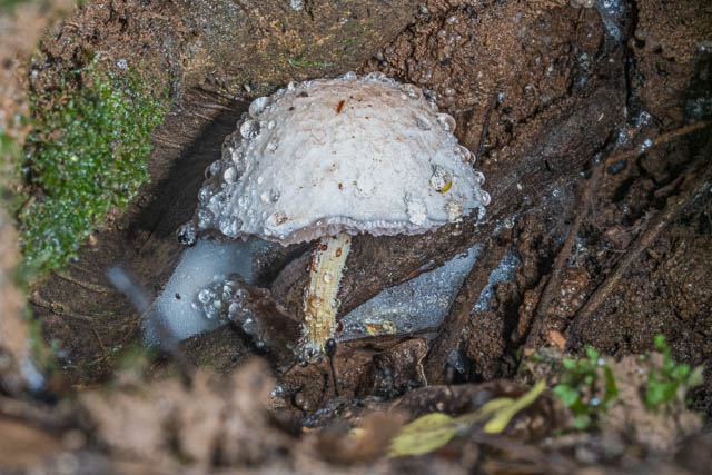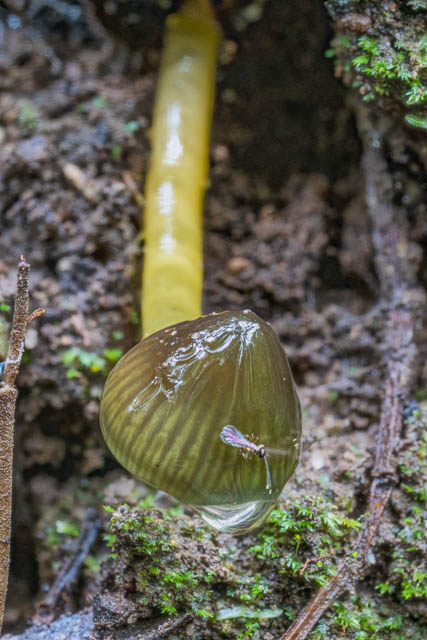 They were out. After some careful looking, I spotted six fruiting bodies. All were quiet small. The largest being around 2 cm tall. They are very hard to spot – being in a gloomy spot, small in size, and often camouflaged by moss and other vegetation. These are what I believe are members of the Gliophorus psittacinus species group.