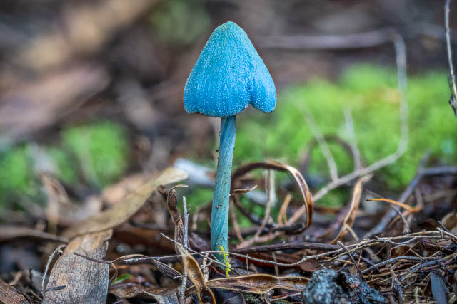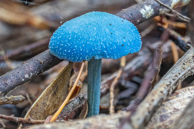 The beautiful light blue mushrooms I had observed before were still present. Entoloma virescens group –