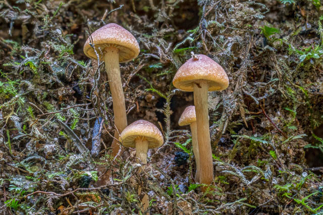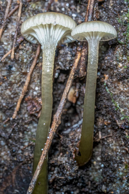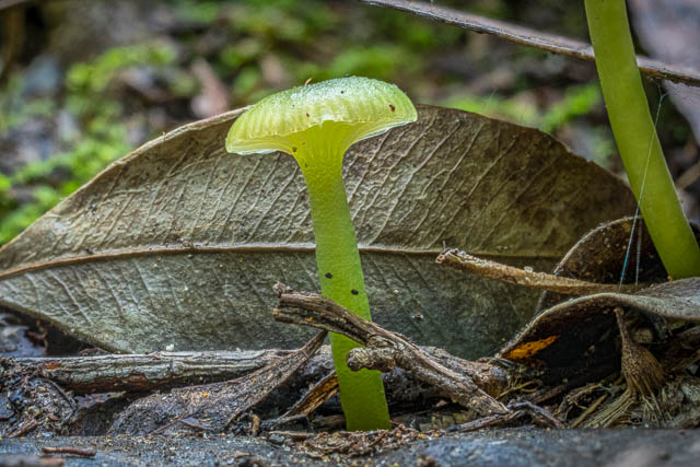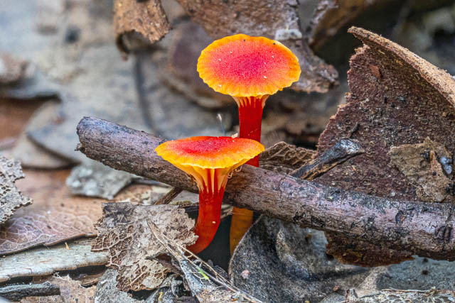 I found these interesting waxcaps in a dark, moist nook. I have no idea what they are. Hygrocybe sp. –