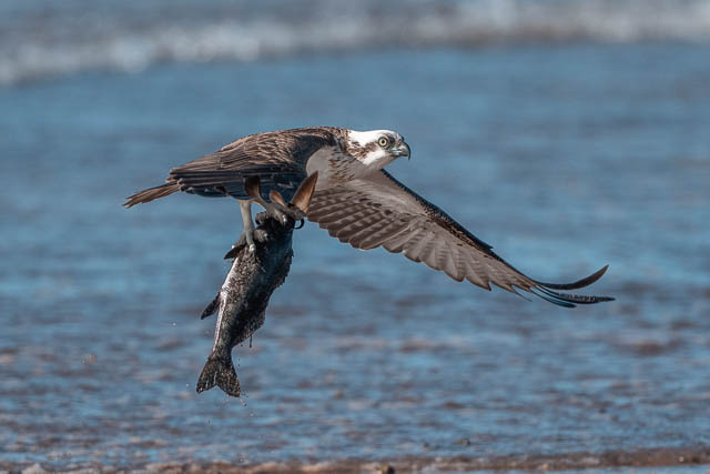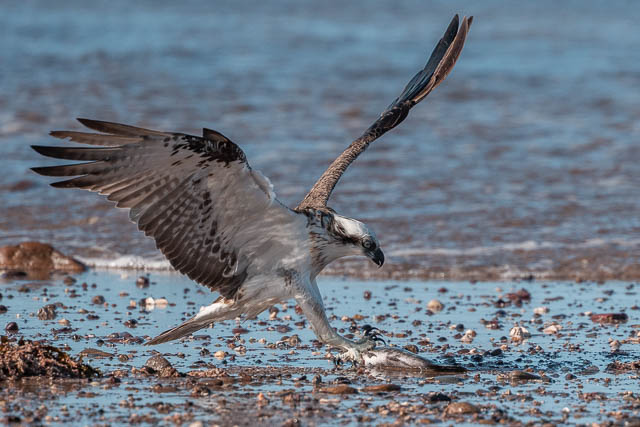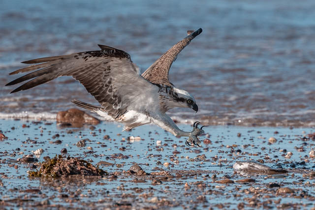 It swoops down and grabs a dead fish on the beach that has washed up on the sand.