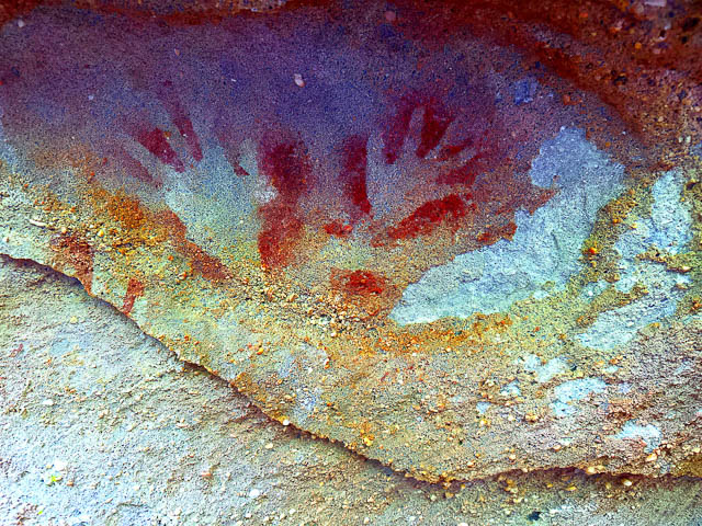 This cave has two red ochre hand stencils in a lower recess. Just walking past the cave and casually looking, you would not see the art.
