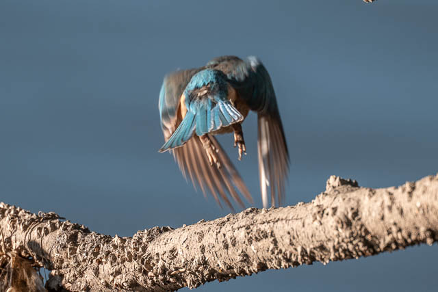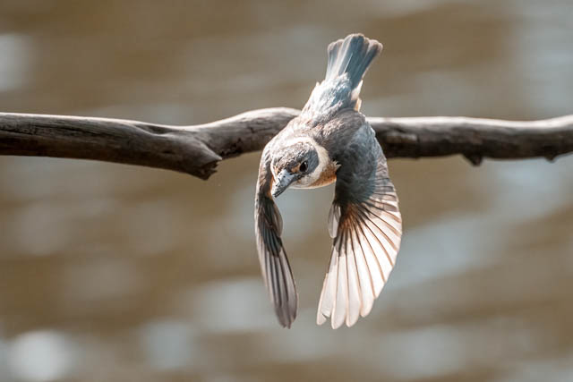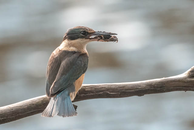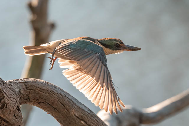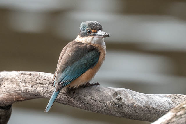 As I walked closer, I saw a Sacred Kingfisher fly our from the same tree and it headed over to the far side of the river. I thought I had seen the flash of another Kingfisher chase it away. I waited bit, and a Sacred Kingfisher perched back on the same tree.