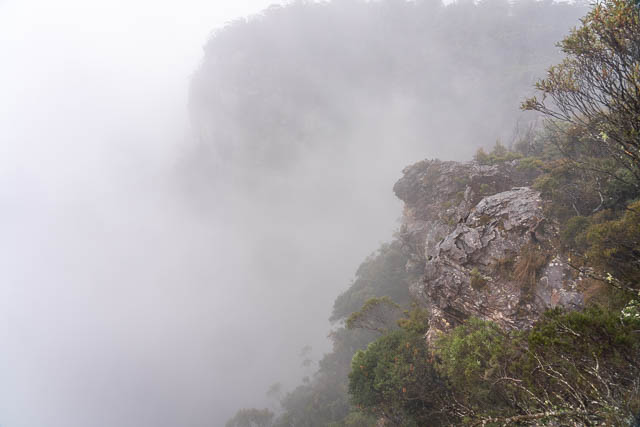 Wow then headed up to Katoomba and walked out onto Reids Plateau. We expected some mist in the valley that would obscure waterfall views, but there is a shelter cave there that is quite protected and dry and a good place to wait to see if things will clear.