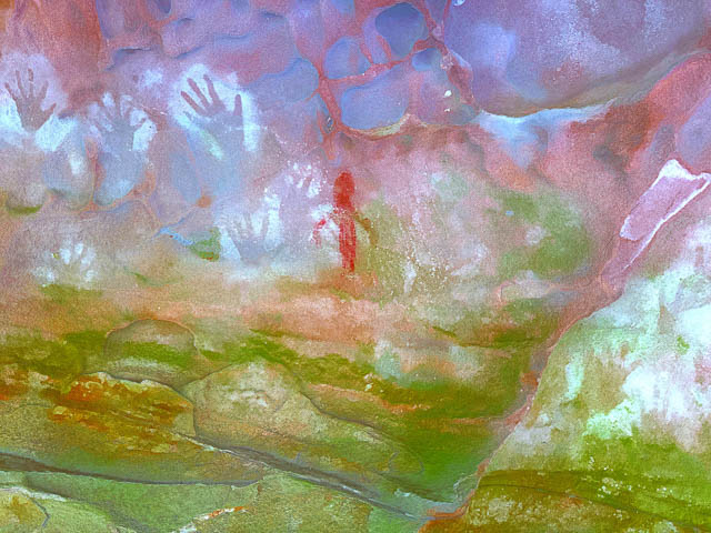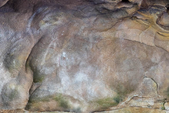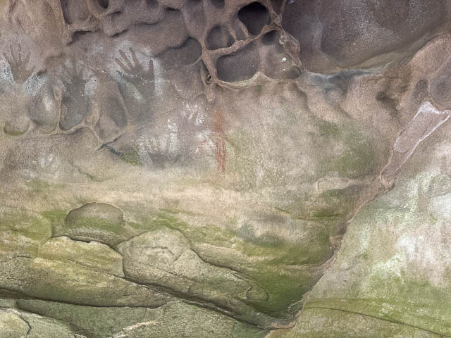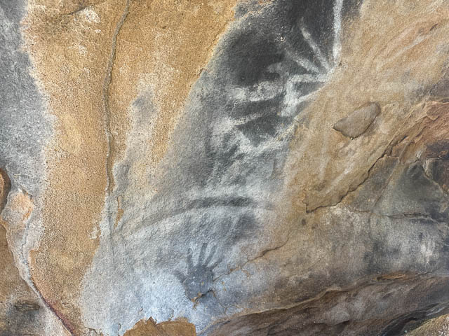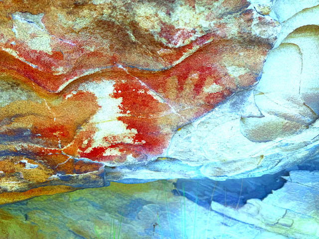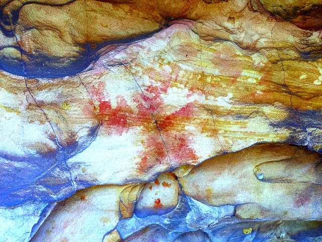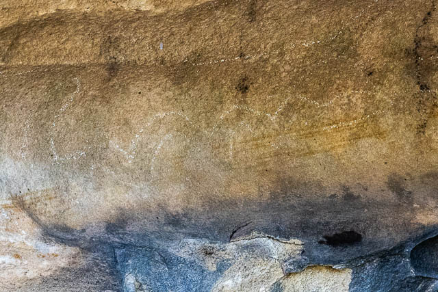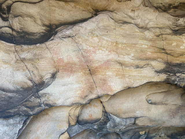 In the middle of the photo below, there is a red ochre motif. It looks like a human figure. There is a faint white circular motif to the right of it.
