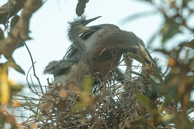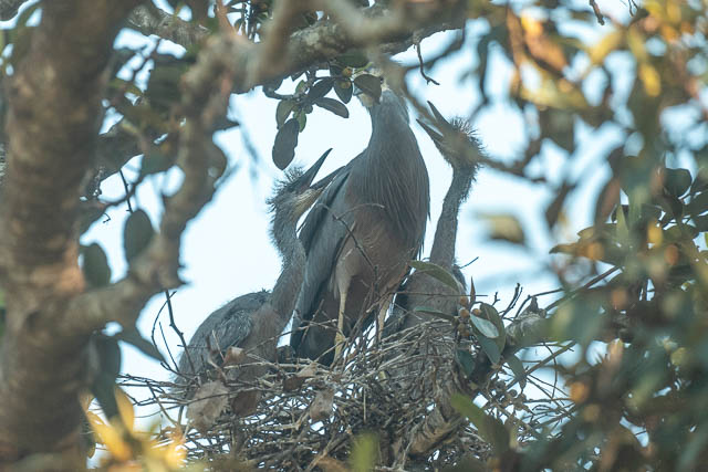 White-faced Heron nest with adult and three chicks –