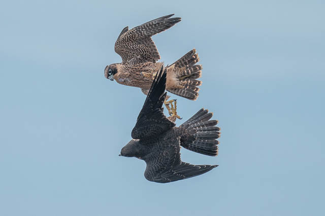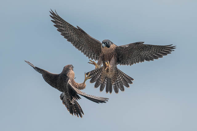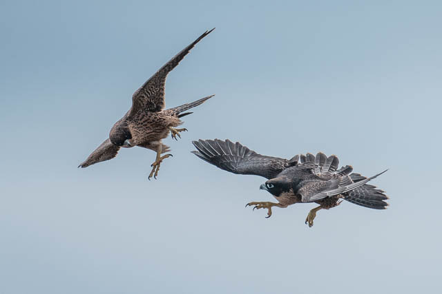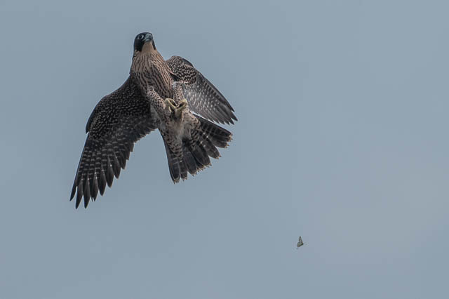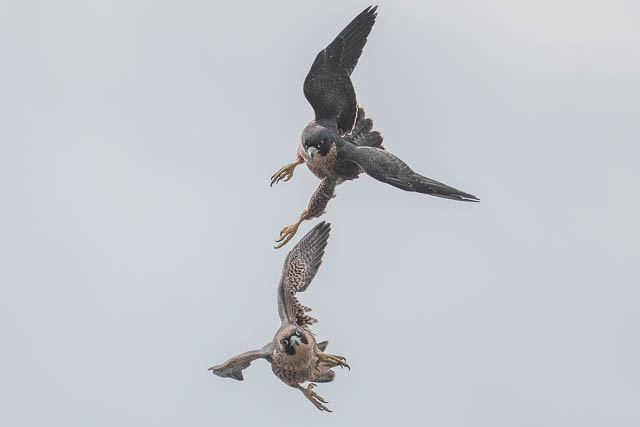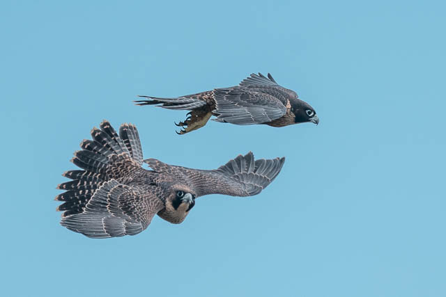 There are three juveniles in the family. But with Peregrine Falcons, I have observed when there are three chicks, two of them often seem to team up, while the third is an outsider. We did see three chicks in the air at the one time, but not for very long.