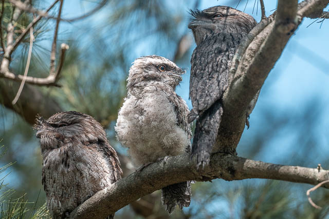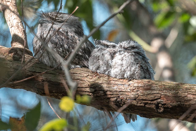 There are often nesting Tawny Frogmouths at the Boat Harbour, but on recent visits I had not spotted any. This time, we spotted two adults with a fledgling –
