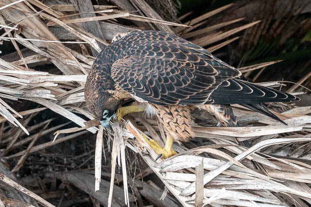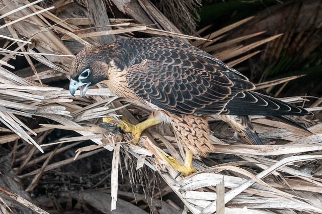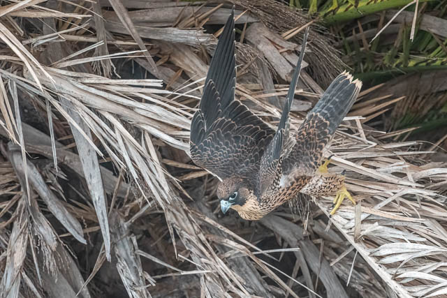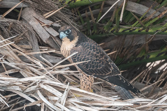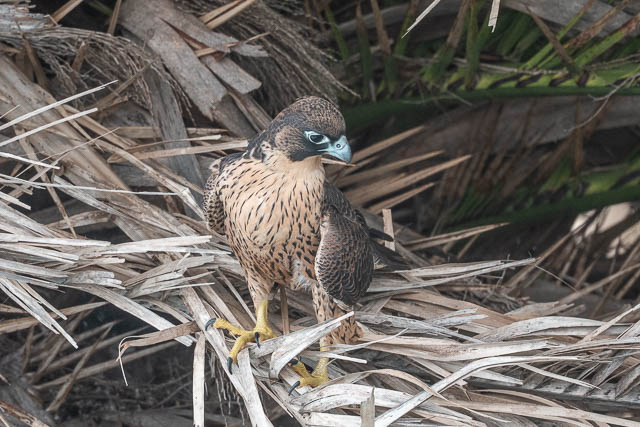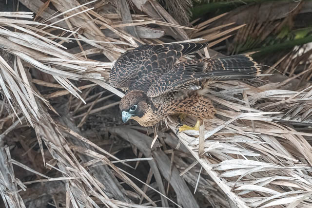 One of the juveniles lands in the same palm tree as earlier. This time it has a better spot.