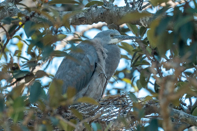 At the White-faced Heron nest we observed, only one chick has survived. And one parent was recently killed by a cat. Here is the remaining nestling –