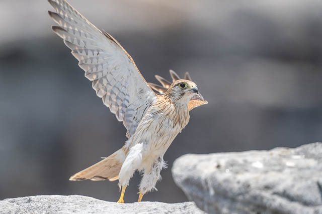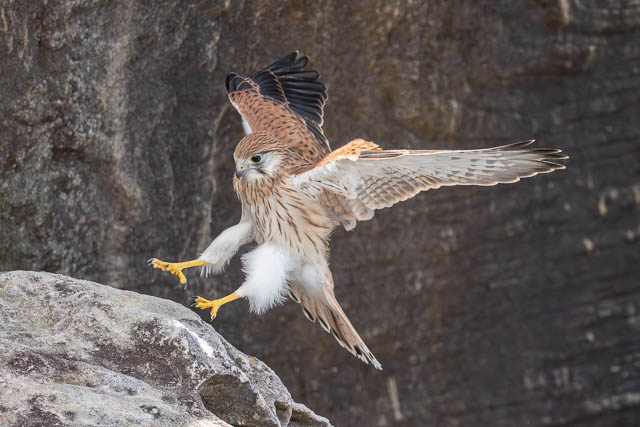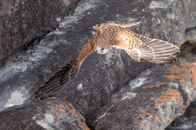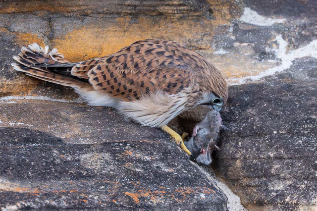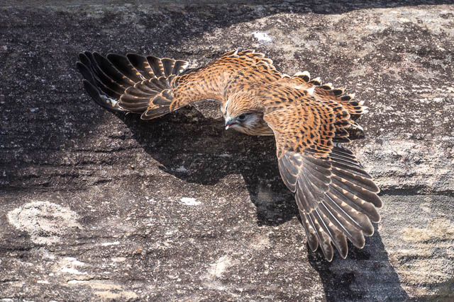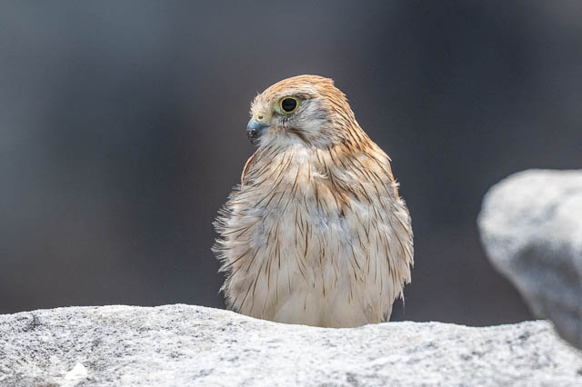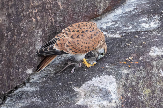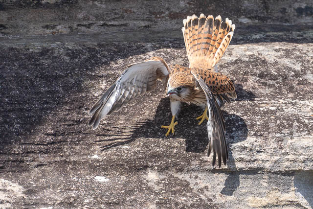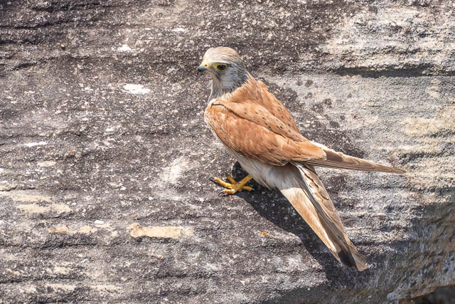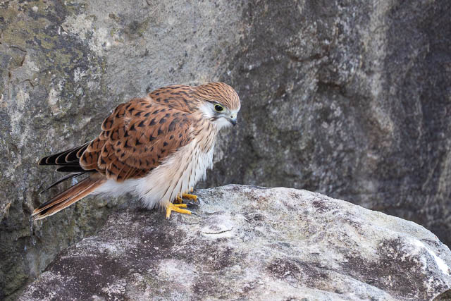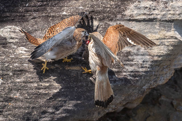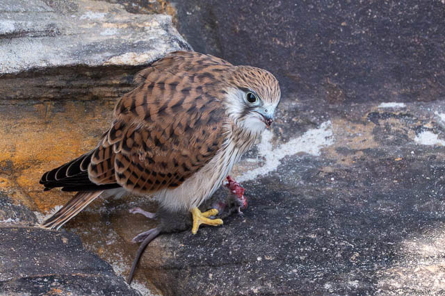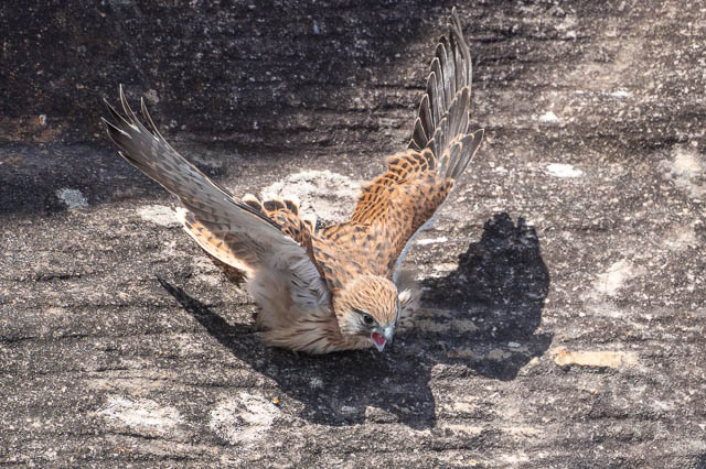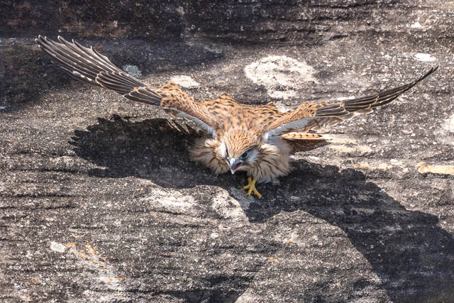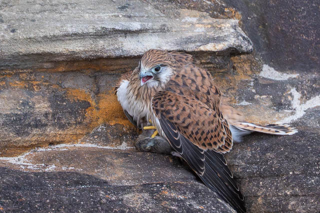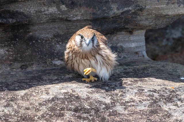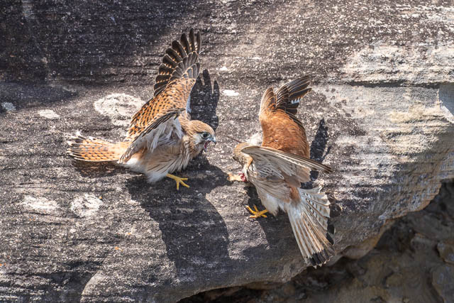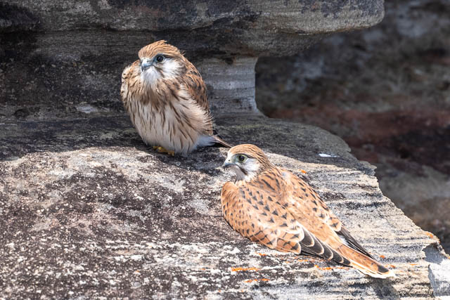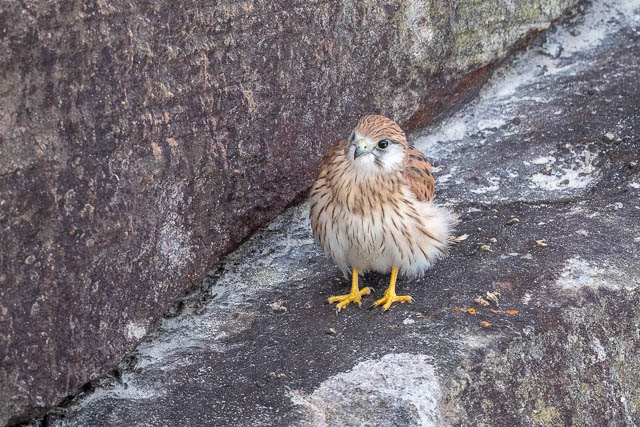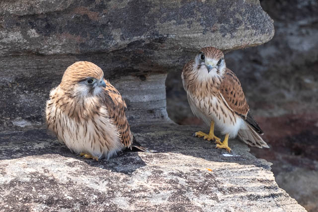 we had not seen any chicks and the nest – small cave lower down on the cliffs was empty. So I thought chicks may have fledged and be perched somewhere on the cliffs. As we were leaving, we looked down on another ledge and spotted two beautiful Kestrel chicks. They too had fledged.