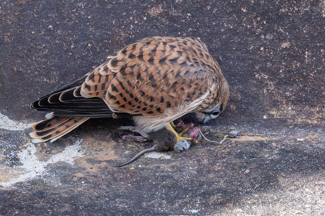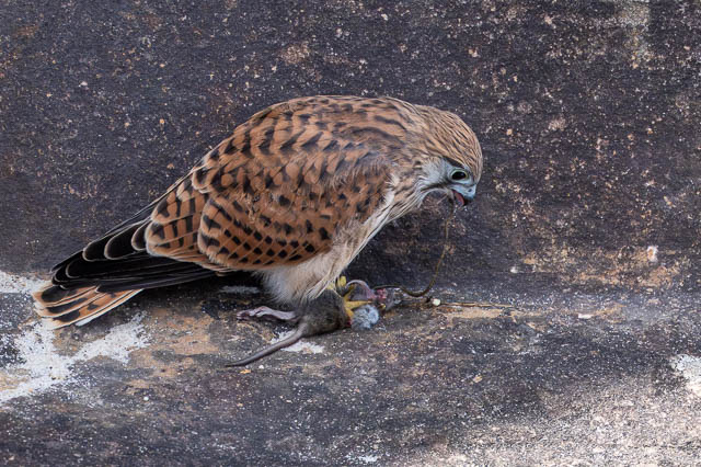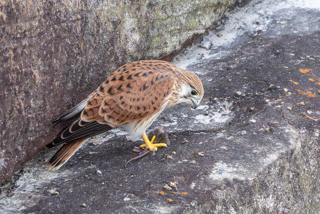 One of the chicks moved along the ledge to where some food had been left. It looked like the remains of a mouse.