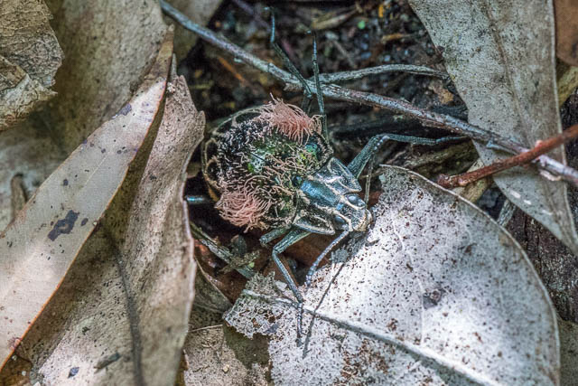 But the most interesting finding was a beetle wandering through the leaf litter. It had a pink growth on it, and it looks like it had been infected by a fungus. I posted a photo of it on the Australian etymology page and asked if anyone knew what was going on. I had feedback that it was infected with a Laboulbeniales fungus. This group of fungi infect arthropods but do not kill them. This is an example of a commensal relationship. Both Wendy and myself had never seen anything like this before.