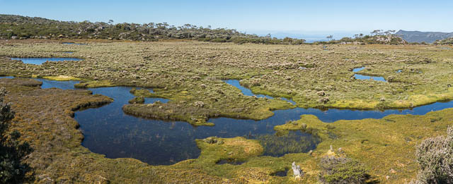 The area near Lady Lake and its hut is certainly very nice. Just outside the hut are a number of small lakes. They make up what is called a “patterned peat bog (or fen)” and the lakes recalled “flarks” and the lad between them called “strings” (or “strangs”). There are a number of these features on the plateau. Also, near Lady Lake is a nice patch of Richea scoparia – and it was indeed in flower. This was a good sign, I knew more patches lay along my route, particularly in the central area of the Walls of Jerusalem. My last visit to Tasmania, in April/May 2016 had been a “fungi and fagus trip”, this one would become a “scoparia in flower trip”.