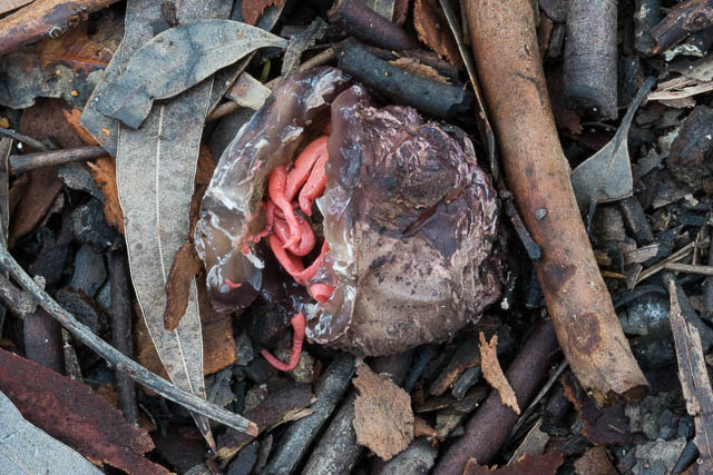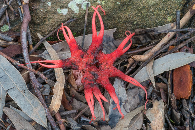 It is always nice to find stinkhorns (except for their smell!). Here is an Aseroë rubra just about to emerge from its “egg” and one that has emerged –
