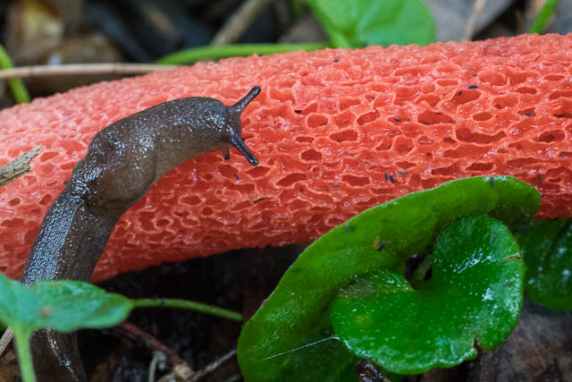 Near Ewan Park – I have often seen a lot of stinkhorns emerging just after rain, so that was where I started. There were dozens of these stinkhorns – Phallus rubundicus. A lot of them had been washed out a bit by the rain, but others were quite fresh. One was being grazed on by a slug.