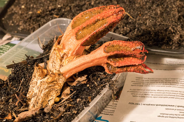 I collected two of these eggs and set them up to record a time lapse of their hatching. This did not work out too well. I had set up the camera to record a series of photos overnight, but my interval was too short (40 seconds between photos). It looks like these stinkhorns (Colus hirudinosus) take a fair while ( 8 – 12 hours?) to fully emerge.