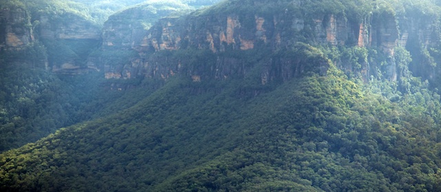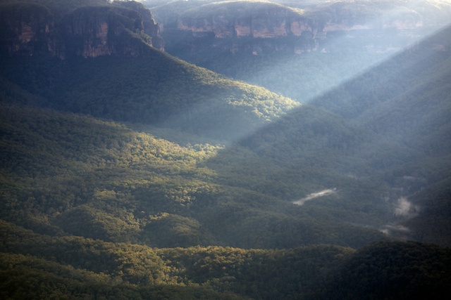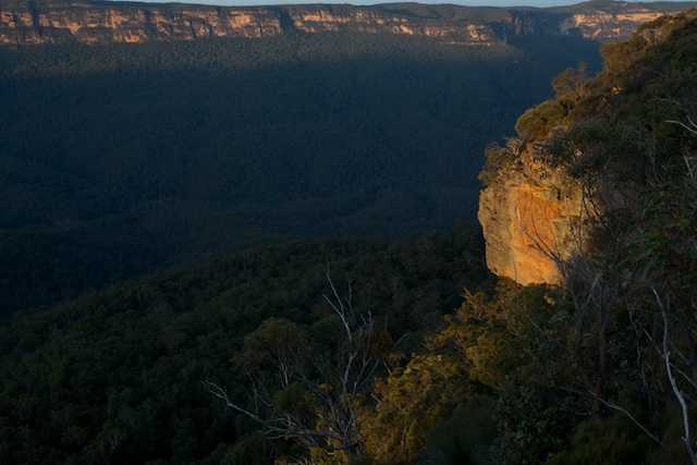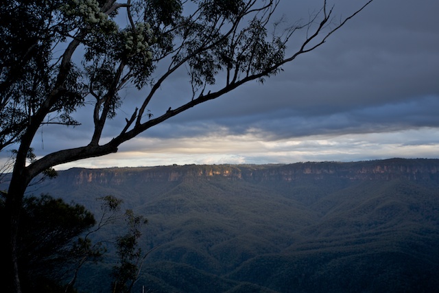 I was hoping the next morning would herald a mist filled Jamison Valley. Unfortunately we were greeted at dawn with a leaden sky. There was only a tiny bit of mist, and rain looked possible. But during breakfast a few sunbeams came down and lit up the Valley of the Waters – a loverly section of the Jamison Valley near Wentworth Falls.