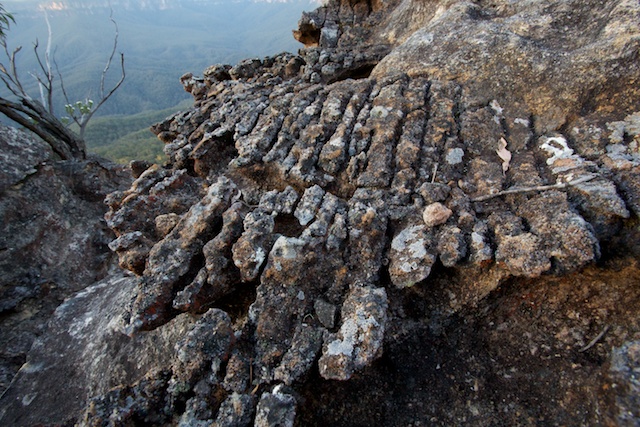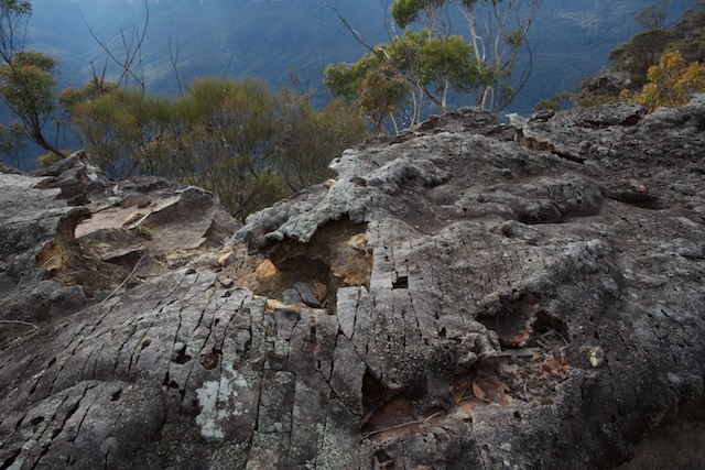 We then continued with out traverse, and soon arrived at our campsite at Singa Jingawell Ck. We set up tents and tarps, collected some firewood and once again enjoyed the views. The advantage of our campsite was that it has water in a very convenient creek – only a few metres away (and it was flowing water too!), and plenty of sheltered sites and all this only a few metres away from the cliffs and the amazing view of the Jamison Valley to the north.