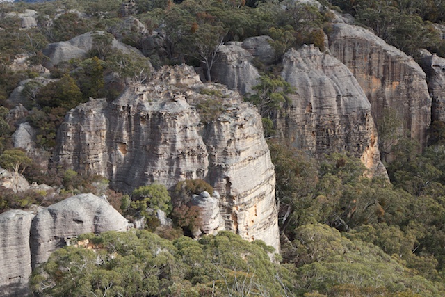 Point Cameron was where we camped on the first night. It is a great place with splendid views looking into the Capertee Valley. To the north lies the mesa of Pantoneys Crown. This impressive table like mountain is named after William Pantoney, one of the members of a party of Europeans to visit the Capertee Valley in 1821. Interestingly enough, it was the site of a proposed nudist colony in the 1970’s. The idea being that the isolated top would be a good place for nudists to wander around well away from prying eyes. However, this proposal did not eventuate, the nudists went to the nearby Rowans Hole and the Crown was gazetted as a nature reserve. It is now part of the Gardens of Stone National Park.