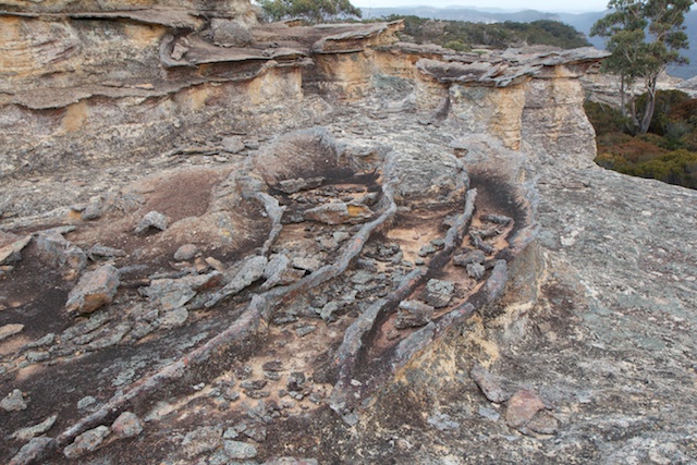 Of interest are the pagodas on the Wolgan/Capertee divide between McLeans Pass and Mt Jamison. On the way – the divide is cut by a large chasm, which turns out to be very easy to cross. Once past this obstacle, you climb onto an open rocky area that is littered with contorted boulders. It is as if a pagoda has exploded and scattered debris all over the tops. To the north lies a pagoda maze known as the “Lost City”. Another interesting area lies on the way to Point Cameron. It is a set of domes. These are rounded pagodas.