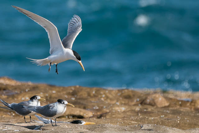 It was a very hot day for September. Apparently 34°C. There are no shady trees on Cape Banks, but there is good shade in caves around the sides. We walked out to the end and then descended down to a nice cool cave on the ocean side. As well as a lot of interesting rocks, there was a nice group of birds nearby – Terns, Silver Gullys and later Sooty Oystercatchers. As well, the odd Cormorant flew past.