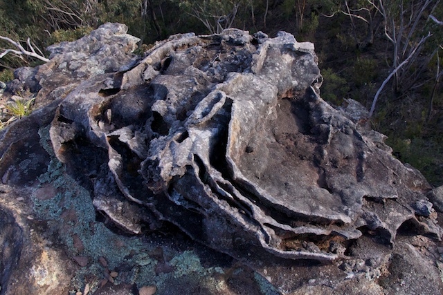 After breakfast I walked back to Asgard Swamp and a little past it to a place where it was not too far to walk to the other Asgard fire road. This short walk through the scrub was indeed very easy and on the way was a very nicely sculptured pagoda. Once on the new fire road – I followed it to the end. This was close to Valhalla Head. Close to it – but not quite there. Ahead was a track that led to a lower lookout. I then went back up to the end of the road and went out through untracked country to Valhalla Head. On the way there was a nice pagoda that offered interesting views down the Grose. Valhalla Head is a little reluctant to offer views. There are no convenient platforms on top and you need to wander down a bit to the cliffs to gain a pretty good view of the upper part of the Grose Valley.