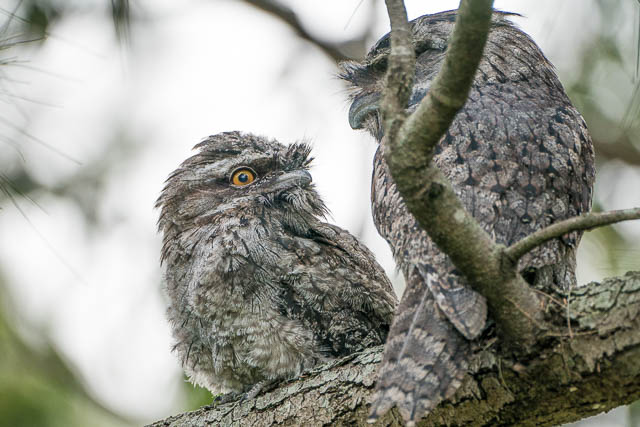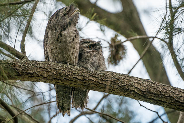 I then spotted the Tawny Frogmouths. One parent sitting on a branch by itself and the other parent and chick close by on a different branch. I took a few photos.