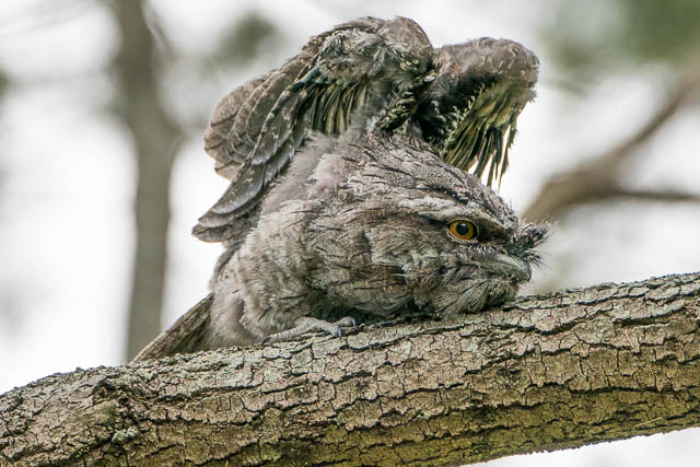 Then the Butcher Bird flew to a perch about 1 m above them and its loud call startled the Frogmouths.