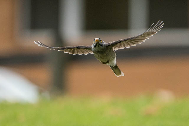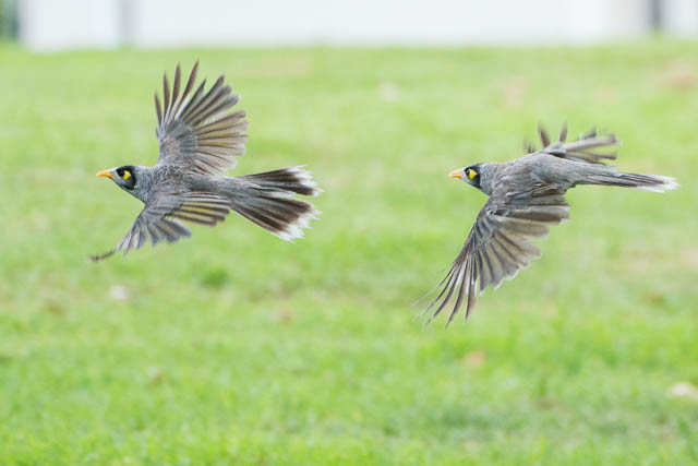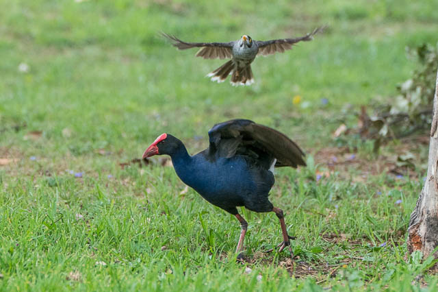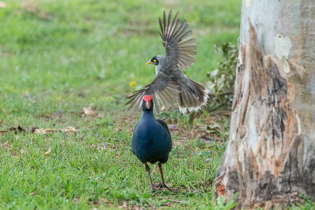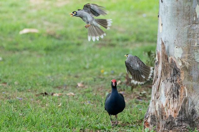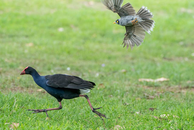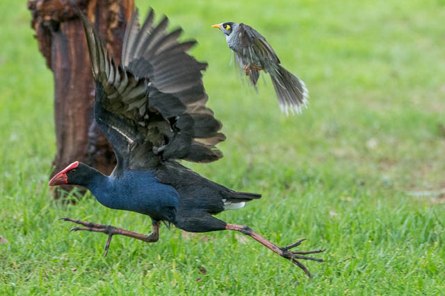 But the Swamphen must have got too close to the Noisy Miners nests or territory, and they aggressively chased it away. This made for an interesting series of photos –