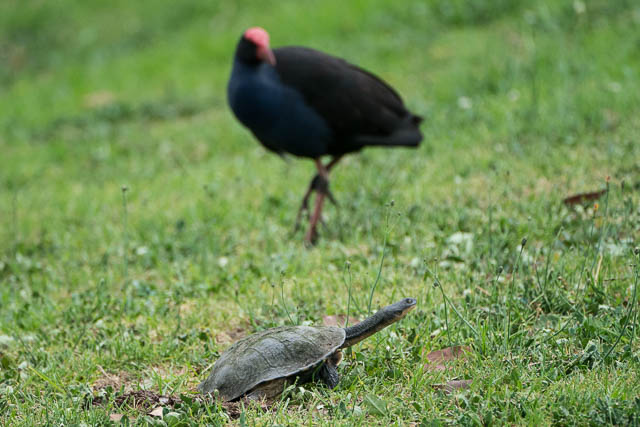 I sat watching for a while to see if I could get a photo of a Miner flying low and close to the turtle – but was unable to. A Purple Swamphen then climbed out of the reeds of the wetland and was also looking for grass seeds. It looked at the Turtle but didn’t get too close.