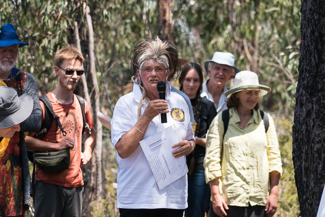 We travelled to the venue via the State Mine Gully near Lithgow and tuned off at the top to assemble. We walked a short way along a ridge where a more formal part of the activity took place. This included a Welcome to Country by Aunty Helen, one of the traditional owners of the land. Then some speeches that included updates on the campaign. It finished with poems and songs.