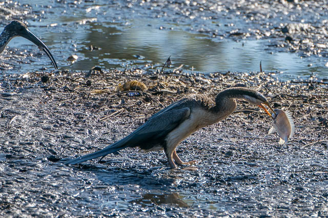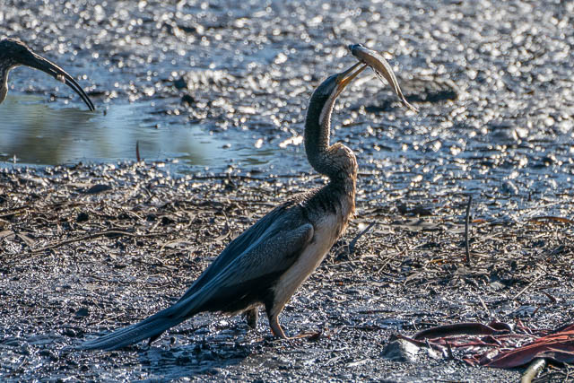 It swam over to the closest mudflat with the fish, climbed out and then spent time trying to manoeuvre the fish for a good position for swallowing. The fish was rather large and the Darter had to place it on the ground to do this. They swallow them head first.