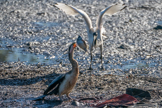 All this playing with the fish attracted the nearby Ibises. They approached trying to get a piece of the action, and perhaps also a piece of fish if they could. But they had no luck. The Darter managed to stretch open its neck and swallow the fish.