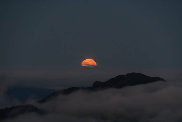 It was, we woke up early, and a few of us climbed up to nearby summits for the sunrise. But before the sun could rise, equally spectacular was the setting moon over the ocean, far to the west.