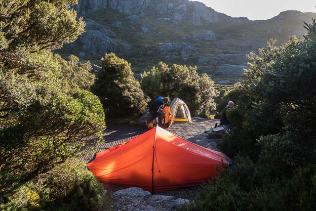 The last part of the day, was the slow climb up to Mt Columba and the High Moor. Its not far, but it always seem to take a long time and its a relief to break out of the scrub onto the open slopes of the moor. We quickly designed down to the lower moor and set up our tents on the platforms. We were soon joined by the Melbourne party.