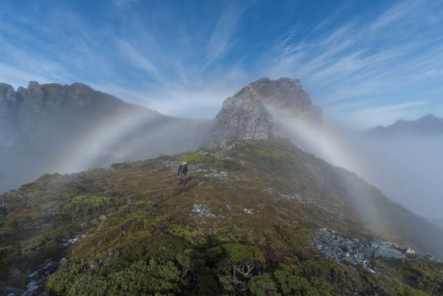 This was a magical morning. A stunning sunrise and then later, after breakfast, the Sun had warmed up the mist in the Arthur Plains valley and it started rising and pouring over the range. We were indeed lucky to experience the most amazing series of fogbows, glories and Brocken Spectres.