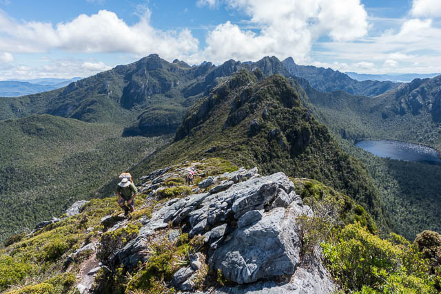 We arrived on the top and could then marvel at the views of the South West Wilderness. Peaks in all directions! But more climbing awaited us. The track climbs up on a broad rising plateau, an old airdrop zone, and this is recorded in one of the verses of an old bushwalking song –