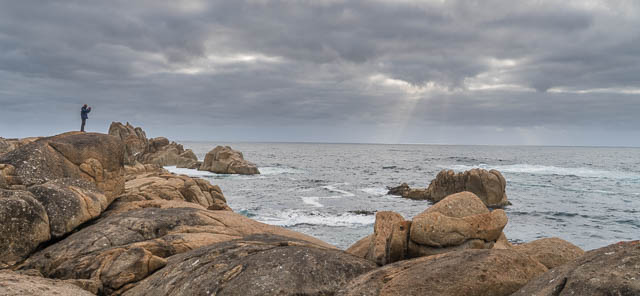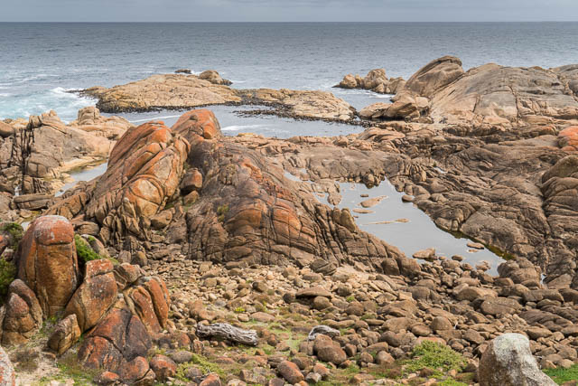 We walked south along the beach and then over a headland and past another shack to reach Conical Rocks. This was a really interesting area. We spent all that afternoon exploring and photographing the rocks. They are a granite outcrop and are amazingly weathered. Some are rounded, others are more pointed, some are gouged out by weathering. Between the rocks and the bush were quite a few four wheel drive tracks – some of which seemed to go over aboriginal middens.