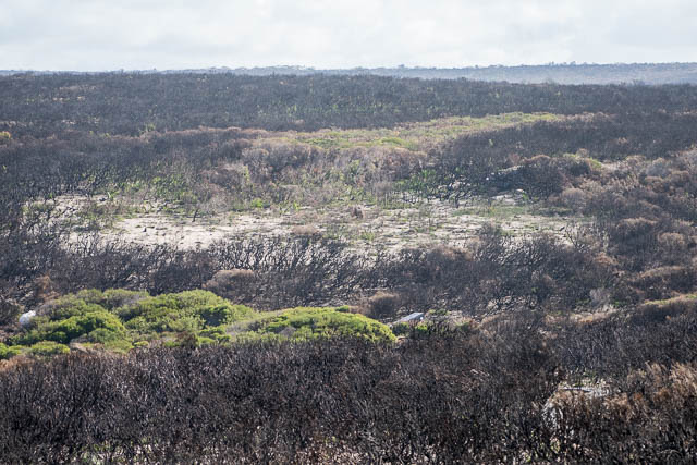 After talking to the track workers, Brian departed to head back, while the rest of the party continued on to Curracurrong Creek for lunch. On the descent, we could see Eagle Rock. Prior to the bushfire it had been obscured by the heath on this side.