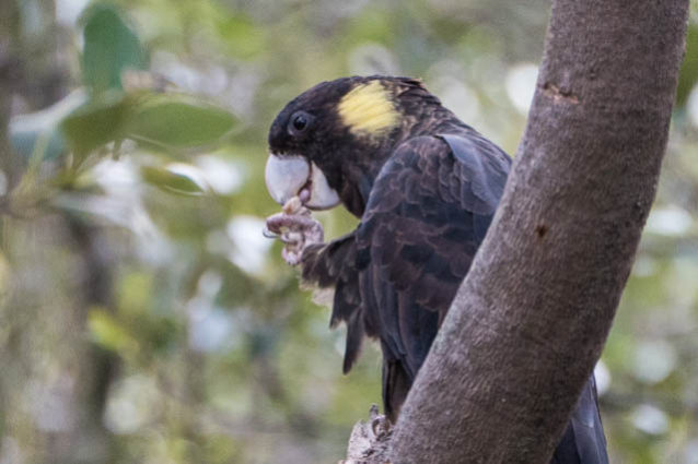 I then heard the calls of some Cockatoos. A group of about four Yellow-tailed Black Cockatoos. They flew off before I could get some good photos of them. But later, walking back, I saw two other visitors to the park – Florence and her friend looking at the Cockatoos. I joined them and we could see one pecking at the bark of one of the Mangroves. I was lucky to photograph it – and it then grabbed a rather large grub from the tree which it proceeded to eat. Here are some of the photos –