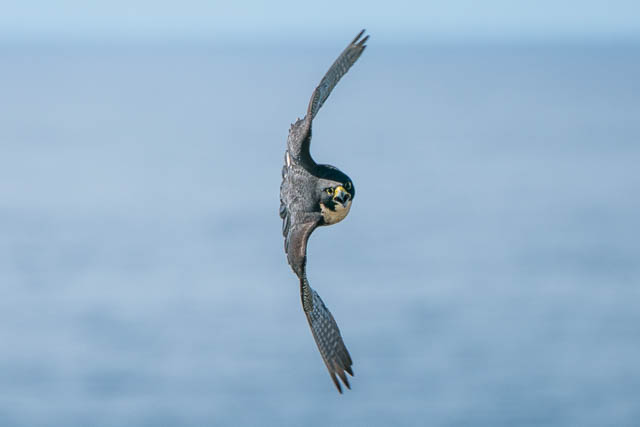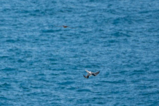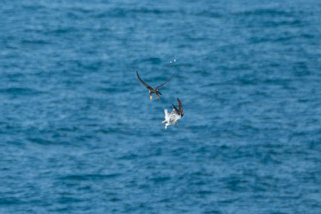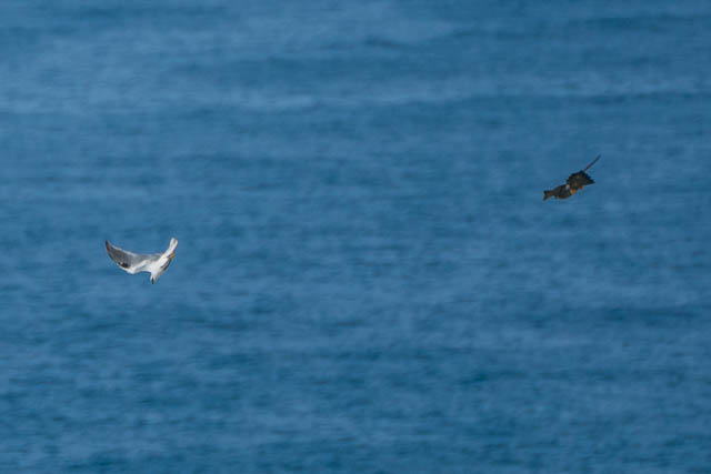 I then saw the Kite suddenly dive for the sea. I though it may be diving to catch a fish. My camera a was ready and I got a sequence of photos of its dive. But, later at home, when I downloaded the photos to my computer and looked at them carefully, I found that there was a second bird in them – one of the Peregrine Falcons. It was diving at the Kite and the Kite was trying its hardest to flee. The Falcon’s dive, called a “stoop”, is extremely fast and they hit the other bird with their talons to stun or knock it out.