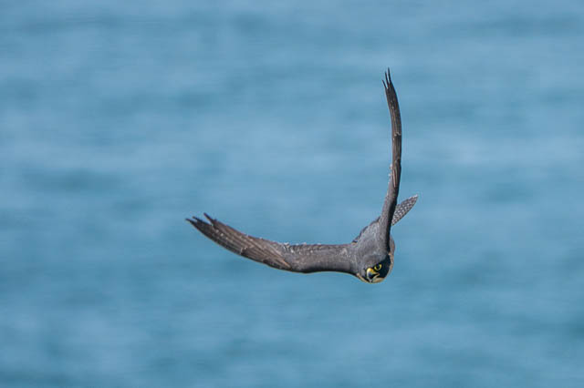 I then walked out to some cliffs on the lookout for the Peregrine Falcons I had seen on recent previous visits. I didn’t need to look too hard – one of the birds found me – and flew around in a big circle. It seemed to do this to everyone that was walking on the Coastal Path. It never got too close, but with the aid of telephoto lens I could get some reasonable photos of it. I assume it is protecting its chicks.