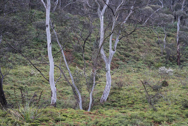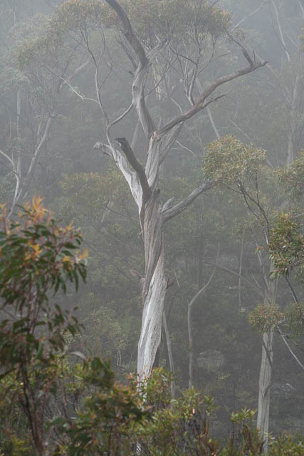 Bob and myself, then continued up the Popes Glen track. In damp and misty conditions it was a pleasant walk. Just before the track ends, we turned off to the left and walked down to the creek, past a pollution trap and then up a street to Govetts Leap Road. We walked one block towards Blackheath and then turned left and down to the Braeside Track.