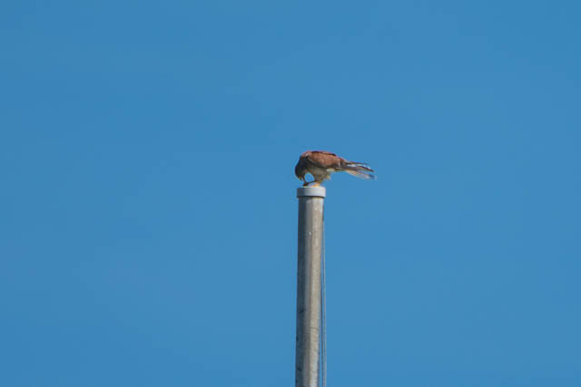Suddenly it was joined by another Kestrel. It was hard to watch both of them. One landed on a post and seemed to have some prey. I walked closer to the post and grabbed a few photos of it.