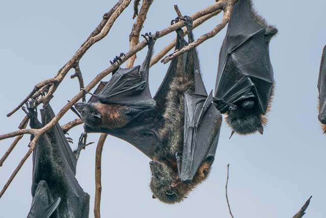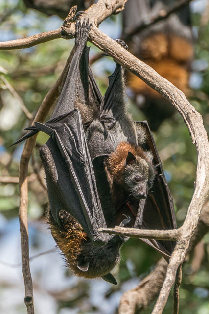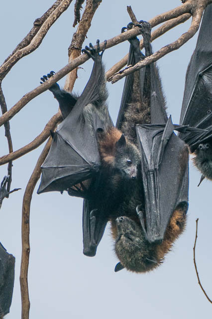 Lower down, I spent some time at the Flying Fox camp. A lot of the female Flying foxes had babies. Most of the babies were holding on to their mothers, but some were now exploring around a bit. Each evening, when the Flying Foxes head off to find food, the baby clings on to its mother on the flight.
