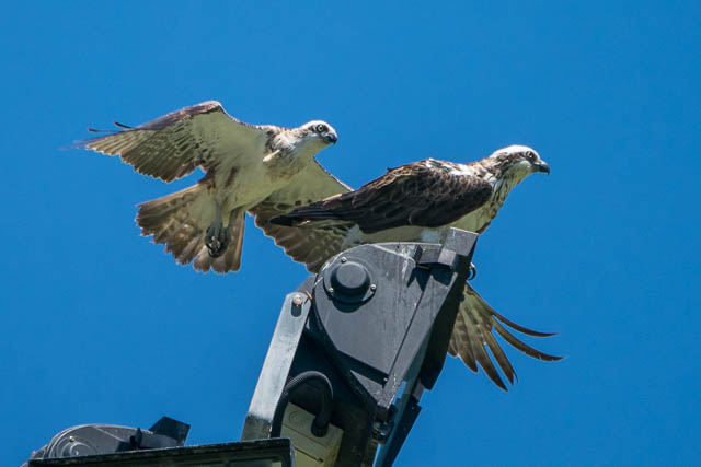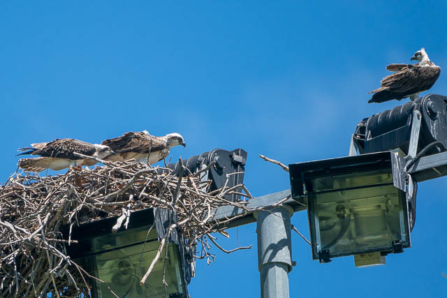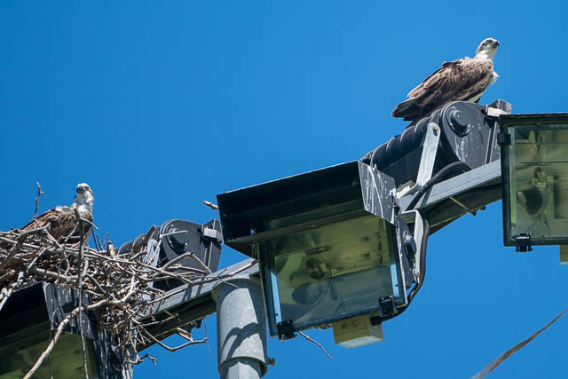 I first visited the sporting field where the Osprey’s have their nest. The parents were not there, but two of the three juvenile Osprey were perched on or near the nest.